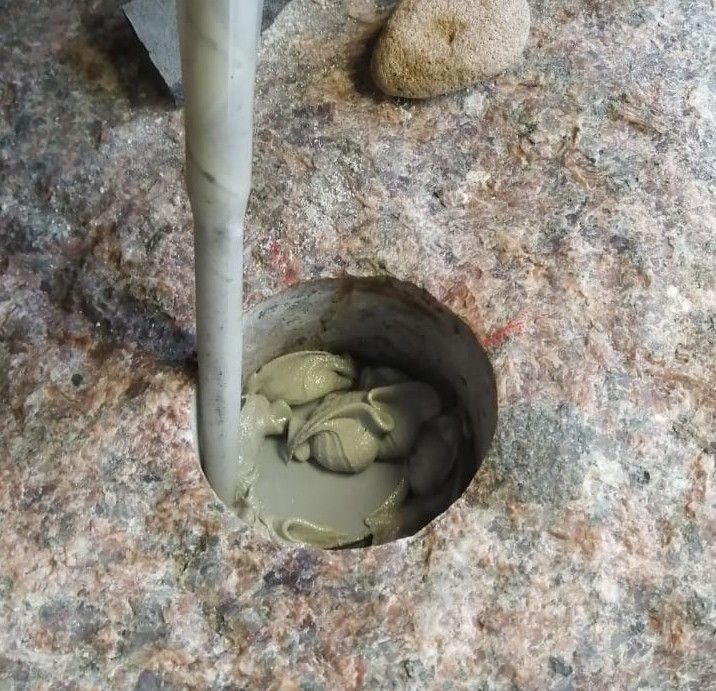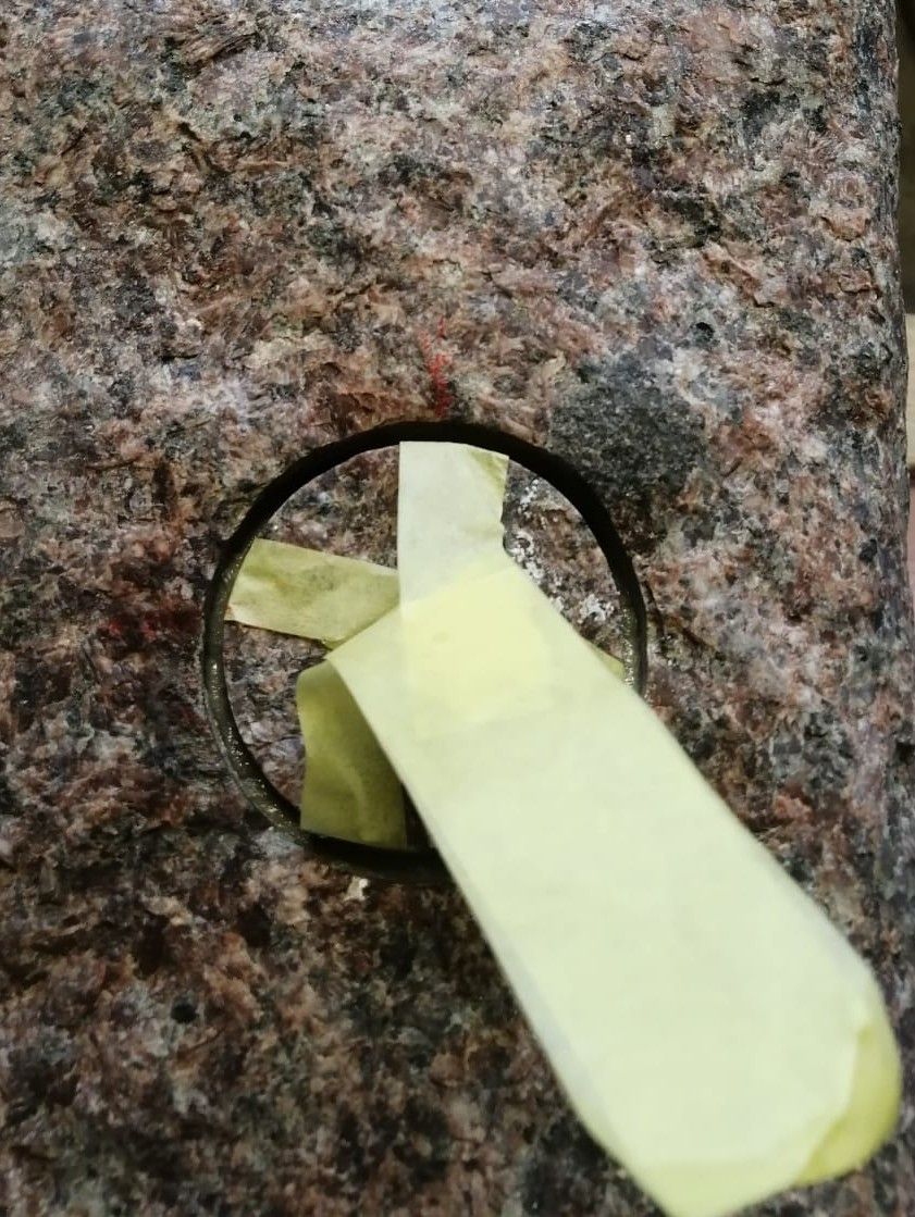 In dem Grabstein nehmen wir dazu eine Kernbohrung vor und in dem vorhandenen Loch wird die Kapsel dauerhaft mit dem vorderen Teil des Bohrkerns versiegelt.